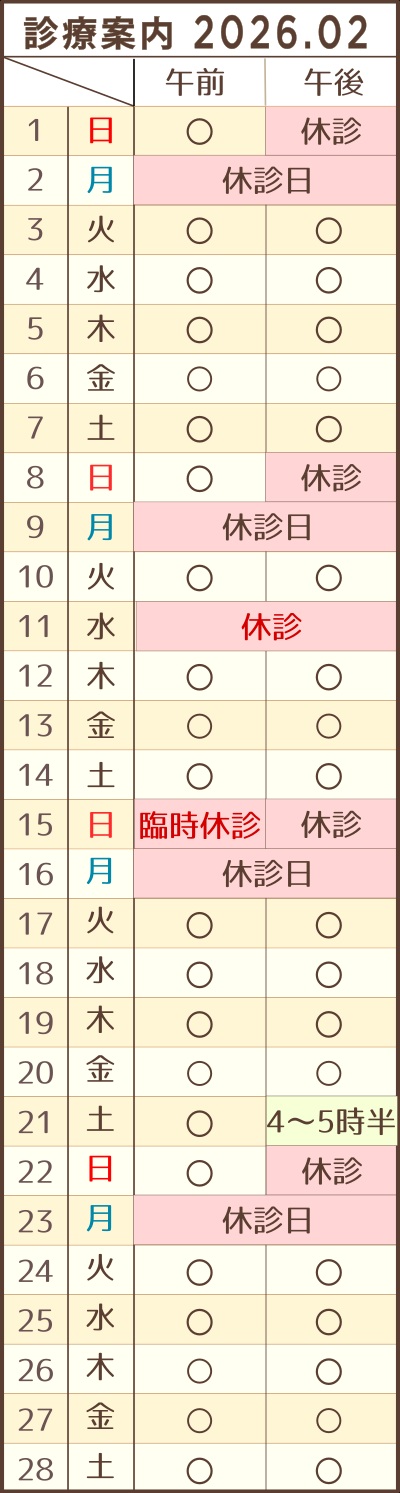 ※2月21日㈯は午後5時半から休診となります。(電話対応等不可)